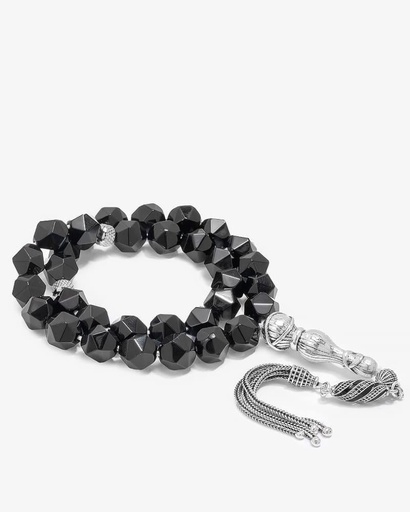 سبحة فضة حجر عقيق اسود لامع بقصة الاماس